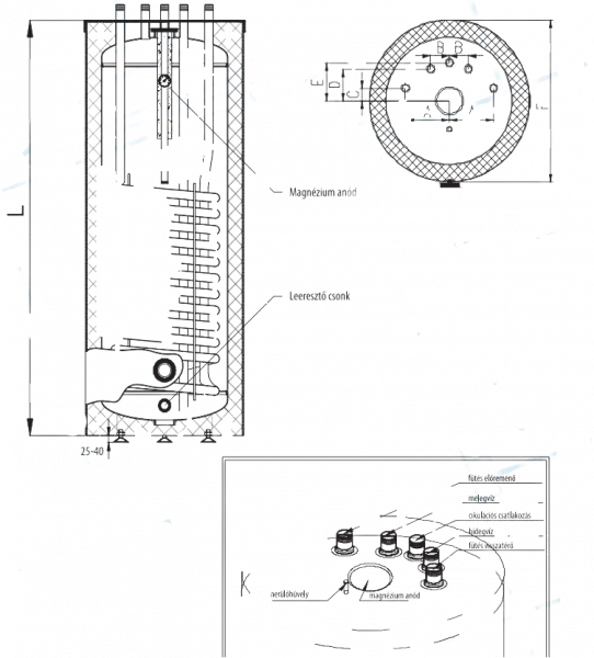 A tartály belső védelmét kerámia zománc bevonat biztosítja. A szigetelés rugalmas poliuretán hab, mely esztétikus lekerekített borítással ellátott (szig. vastagsága táblázatban). A katód védelemről a tárolóban található magnézium védőanód gondoskodik