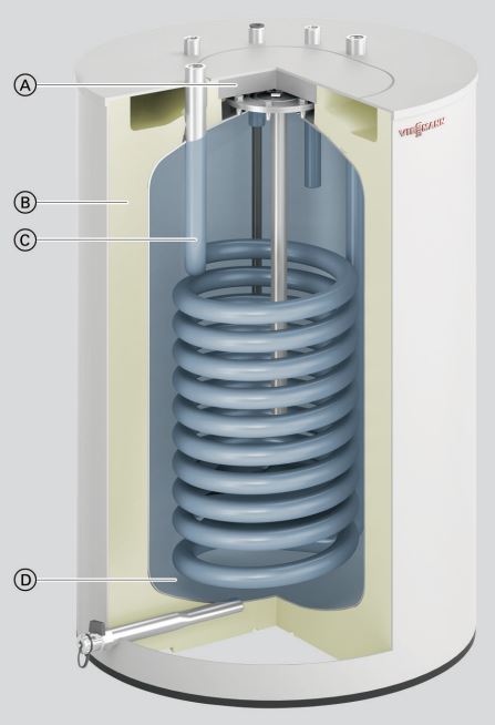 Különösen alkalmas fali készülékekkel való melegvíz készítéshez. Acél tárolótartály acélból Ceraprotect zománcozással.Kiegészítő katódos védelem magnéziumanódon keresztül, idegenáramú anód kiegészítő tartozékként szállítható.A teljes víztartalom felfűtése a tartály legaljáig vezetett fűtőcsőspirálon keresztül történik.