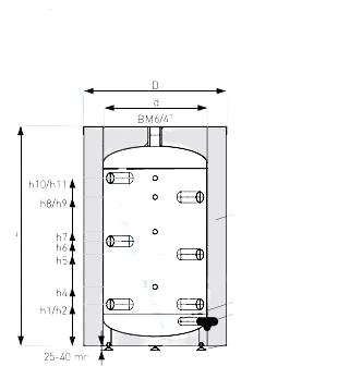 - BM csatl. merülőhüvelynek II (Ø, 200 l) vagy fűtővíz csatl. (BM, 300-5000 l):1/2 / 605mm