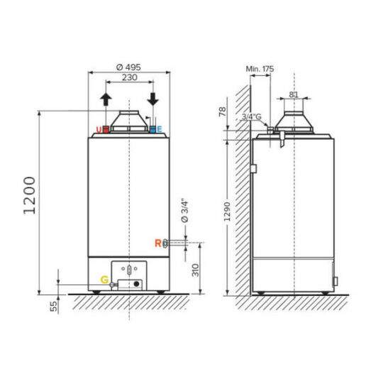 - Álló kivitelű, gázüzemű, tárolós vízmelegítő