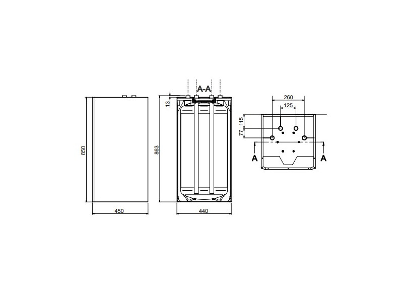 - Kombi puffer tartálytartály a tartályban (indirekt bojler): létezik egy szolár hőcserélős, két szolár hőcserélővel napkollektorokhoz
